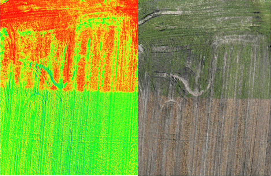 Der hvor der er vegetation er der rød; det er svært at se nuancer på den venstre del af det RGB billede øverst men det fremgår mere klart i NDVI. Baggrunden med træer ses klart en vegetation i NDVI billedet.