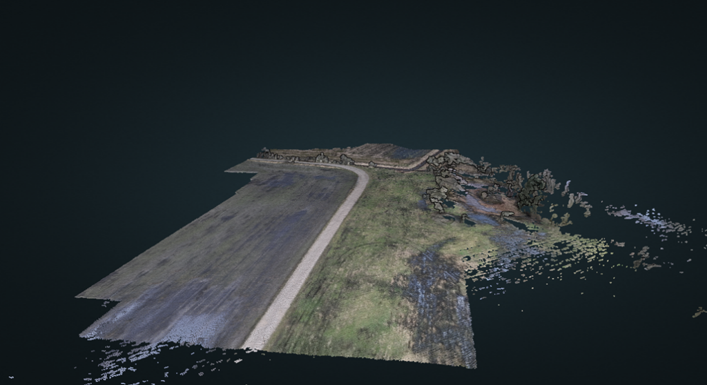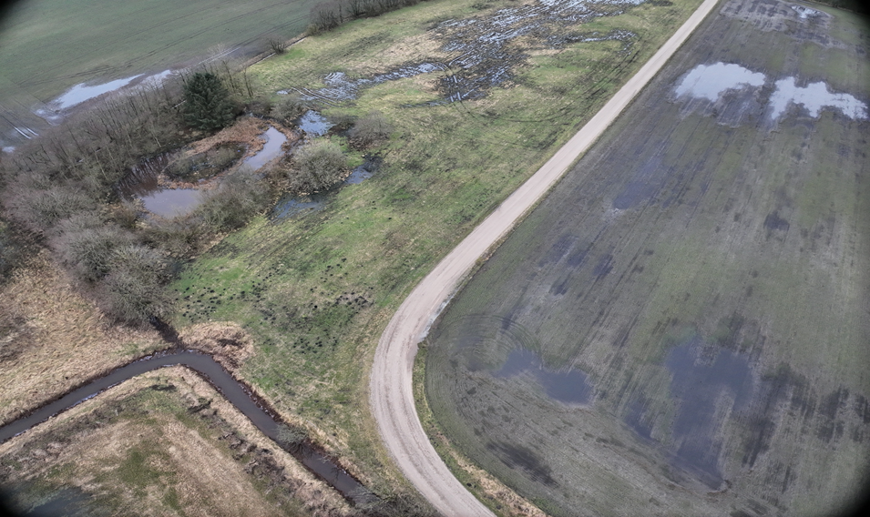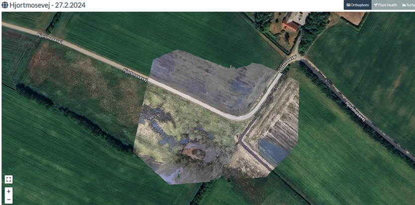 Her under ses google maps billede hvor drone fot orthophoto er lagt oven på således at øjebliks billede klart ses at der er mere vand end googles sommer billede.